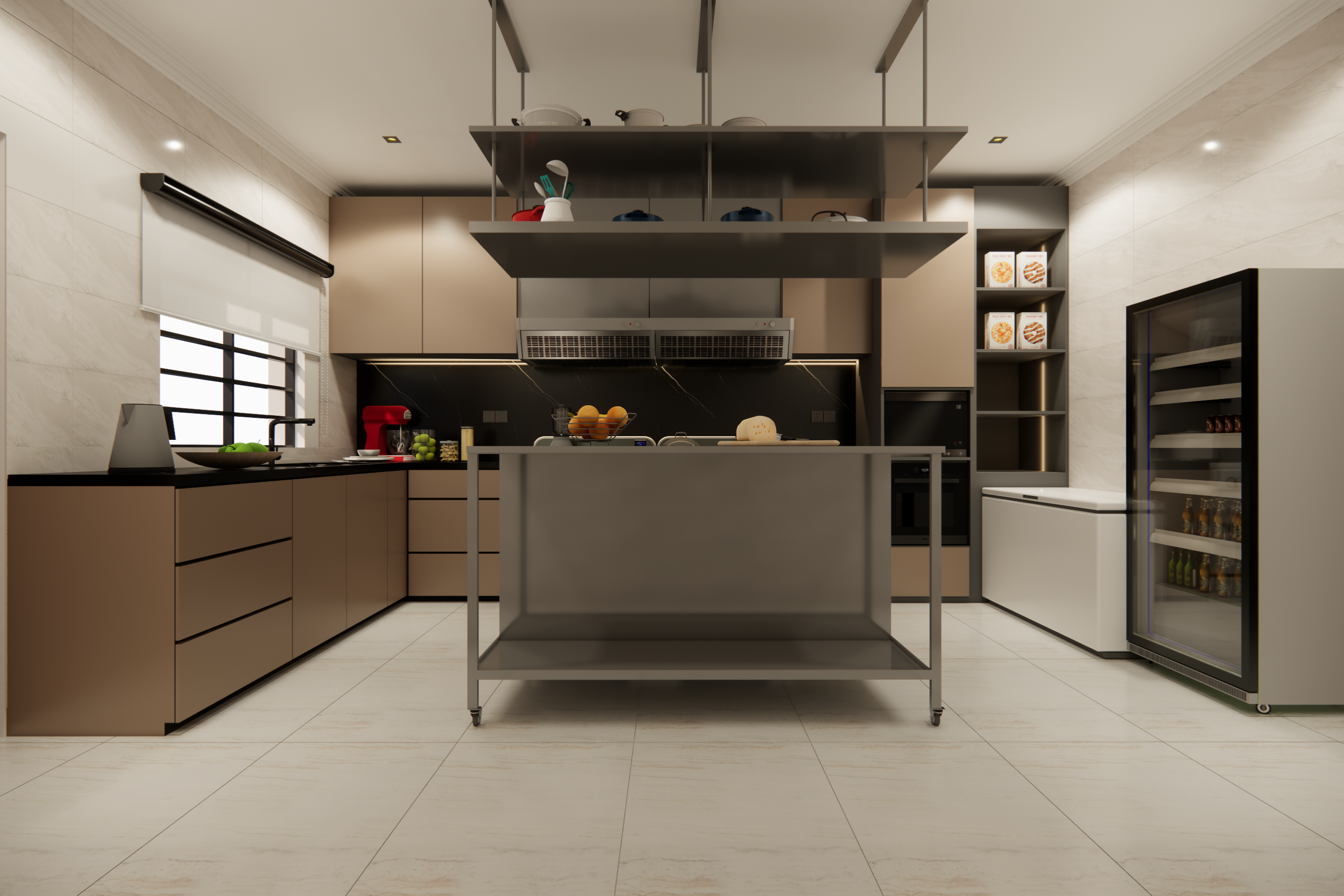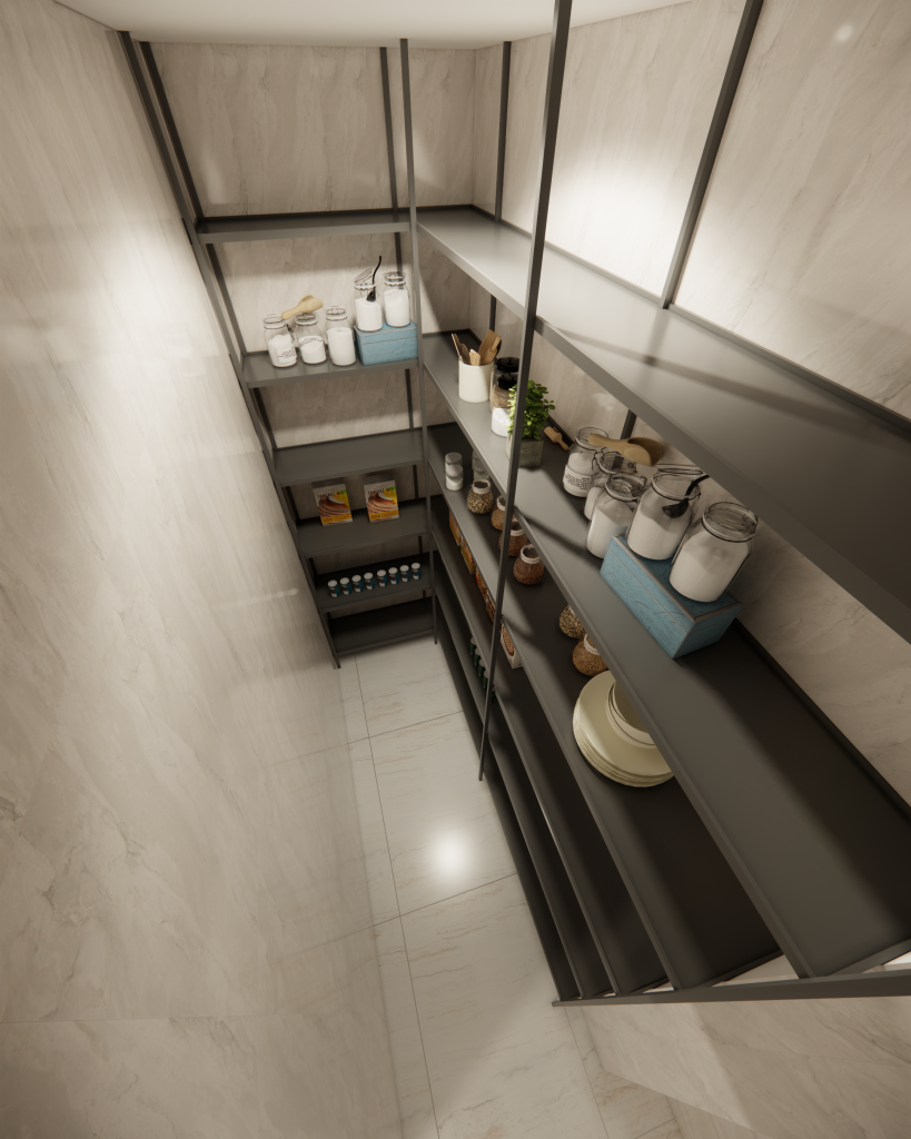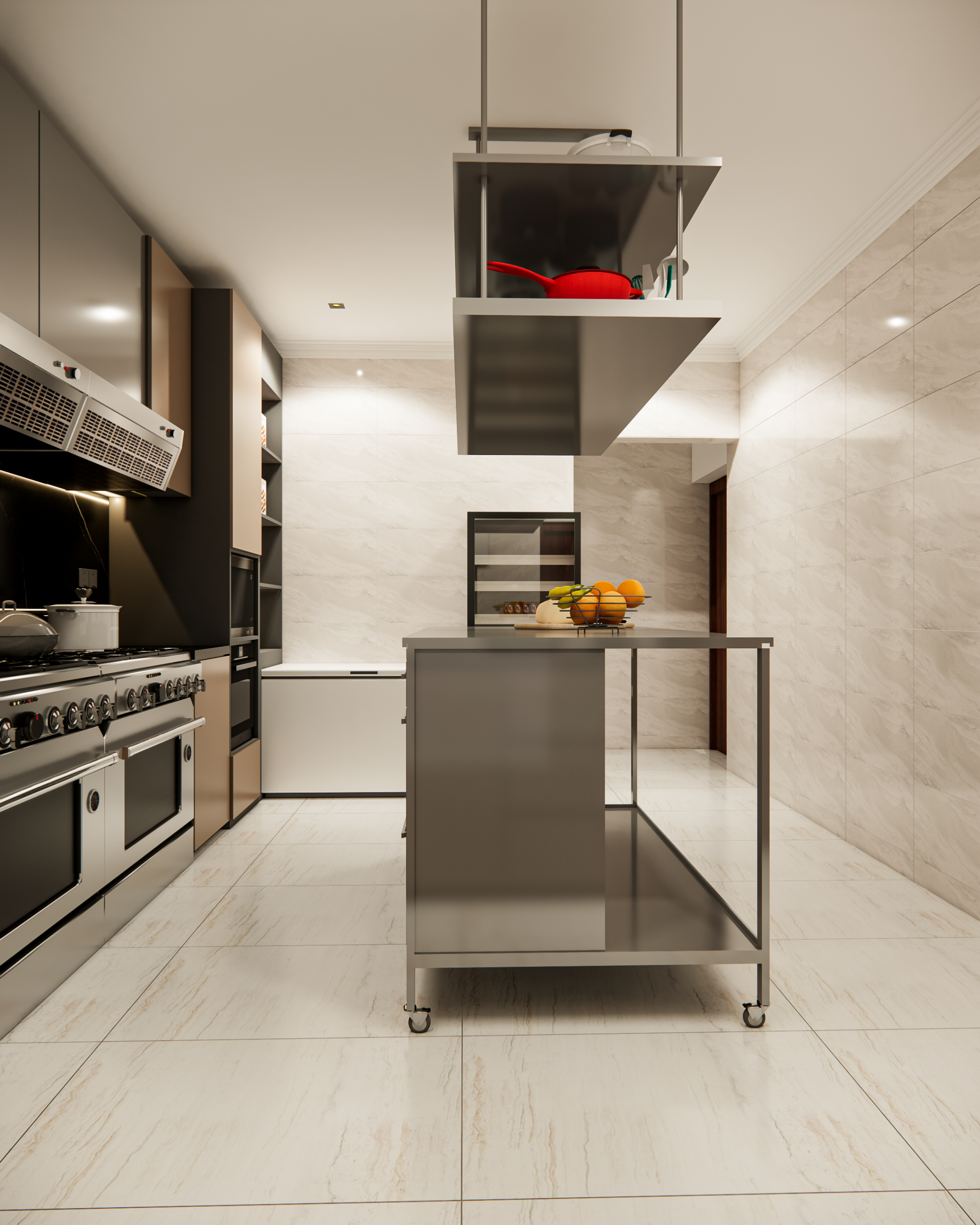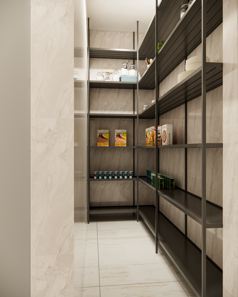 Our design story is all about flow and high-performance function. We created dedicated zones for a seamless workflow, including an industrial-style pantry and a heavy-duty stainless steel cutting table. We imagined this table as the hardworking heart of the kitchen—a versatile hub for intense prep work or even casual tasting sessions. Every element was chosen to be durable, practical, and inspiring for a true culinary artist.