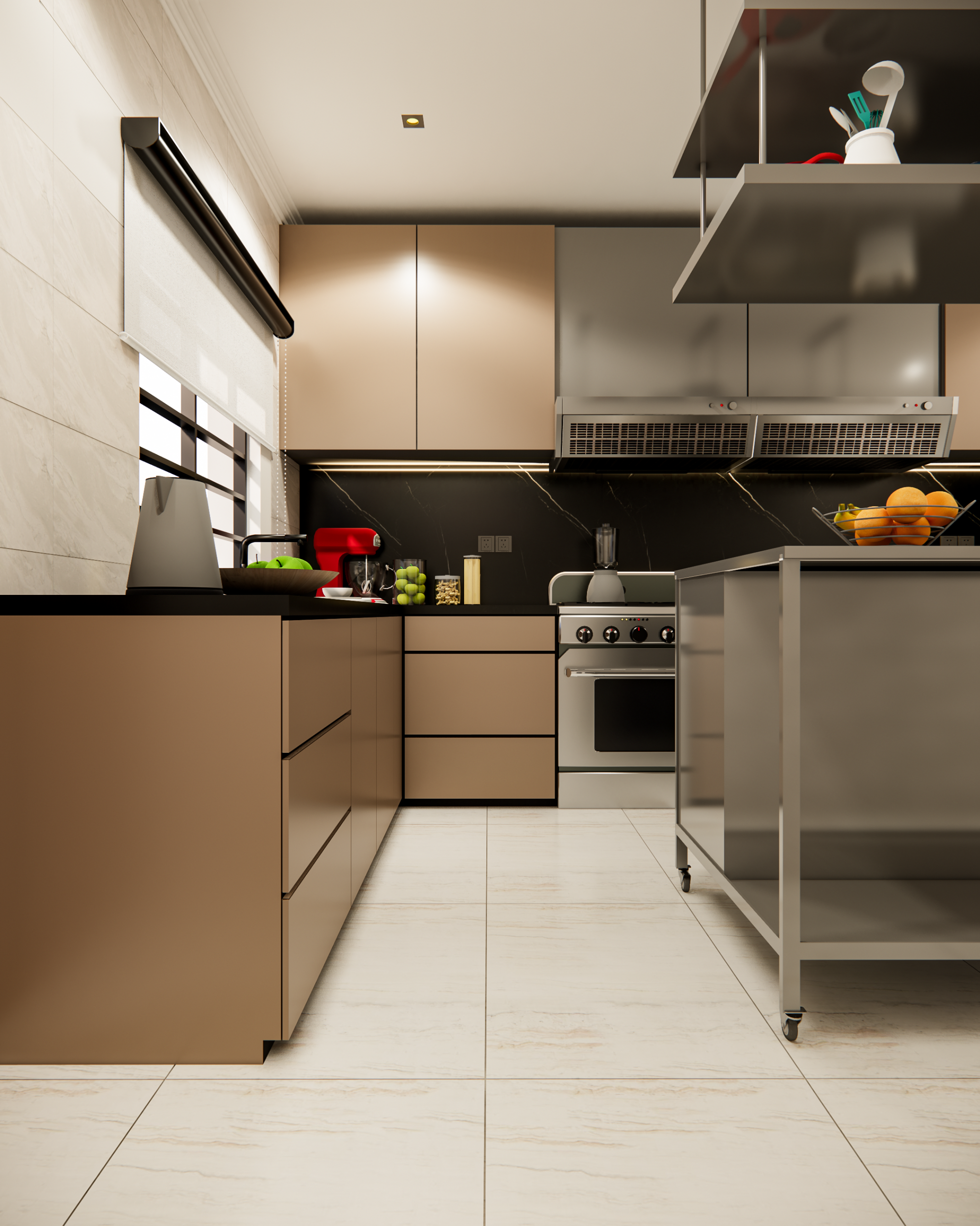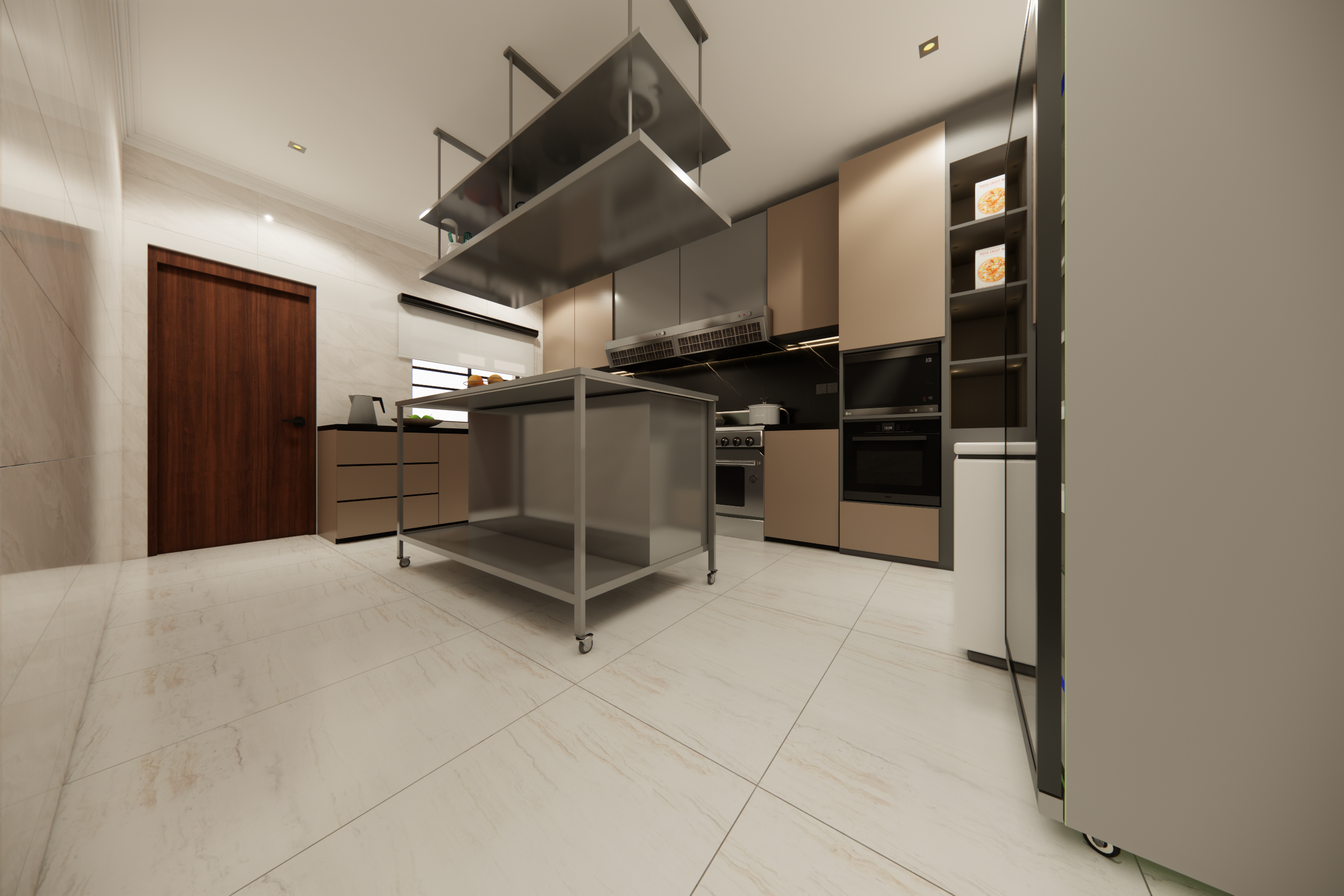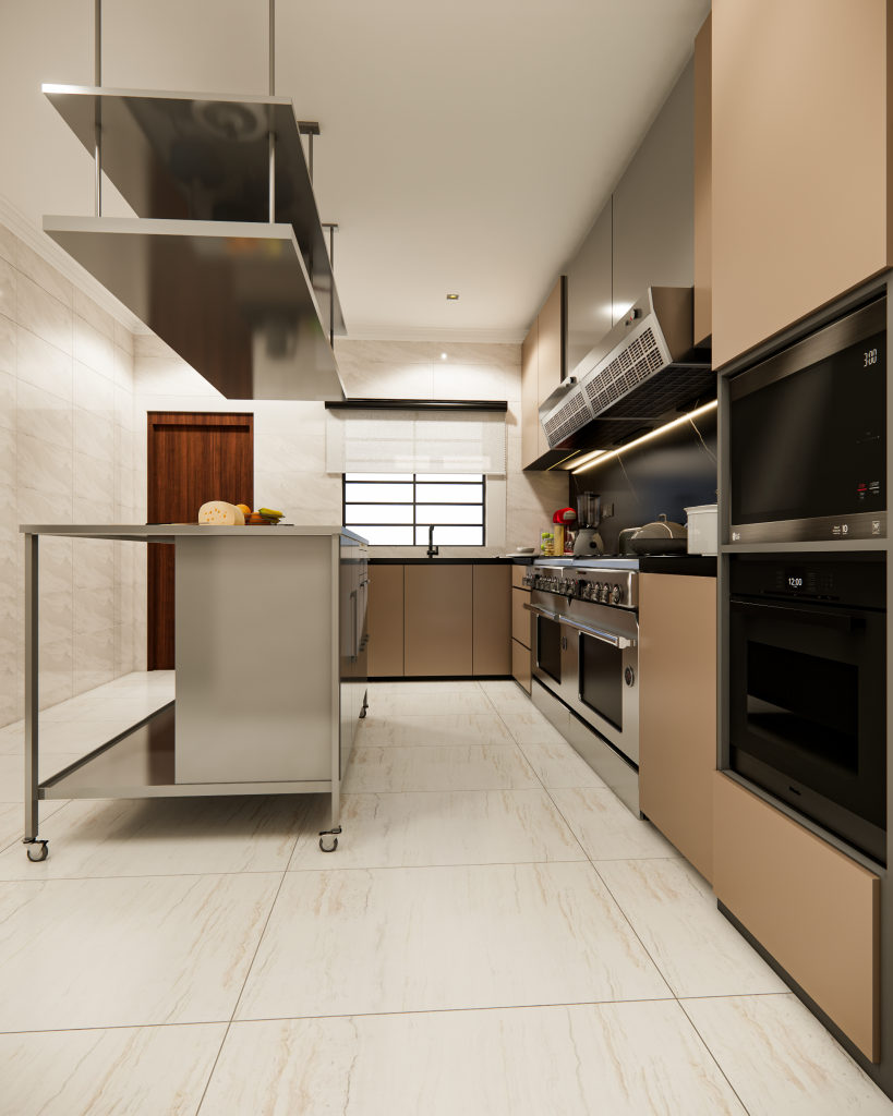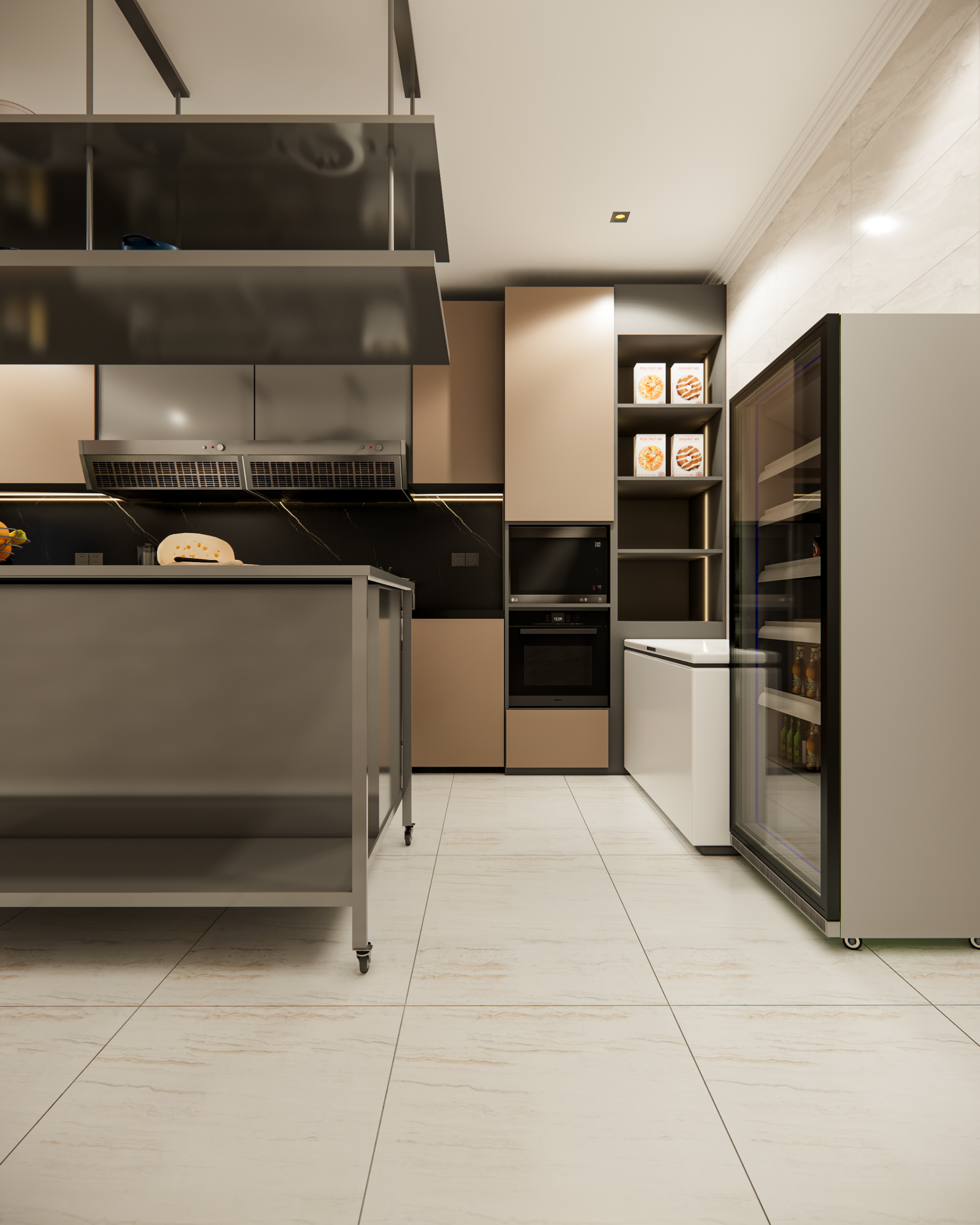 Our design story is all about flow and high-performance function. We created dedicated zones for a seamless workflow, including an industrial-style pantry and a heavy-duty stainless steel cutting table. We imagined this table as the hardworking heart of the kitchen—a versatile hub for intense prep work or even casual tasting sessions. Every element was chosen to be durable, practical, and inspiring for a true culinary artist.