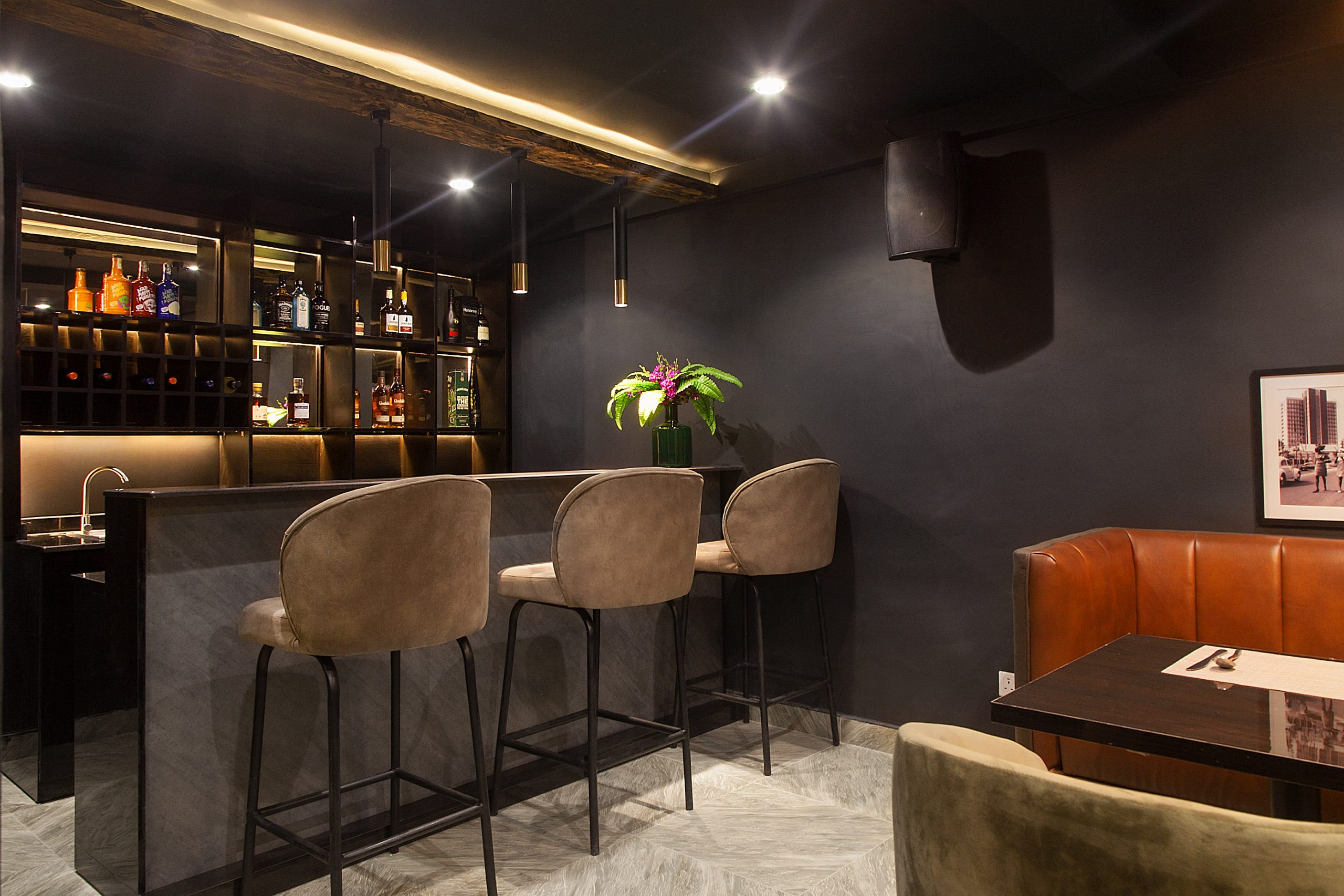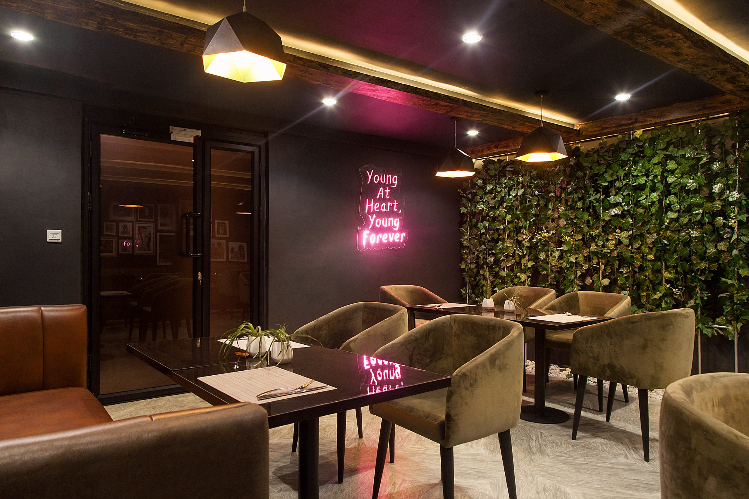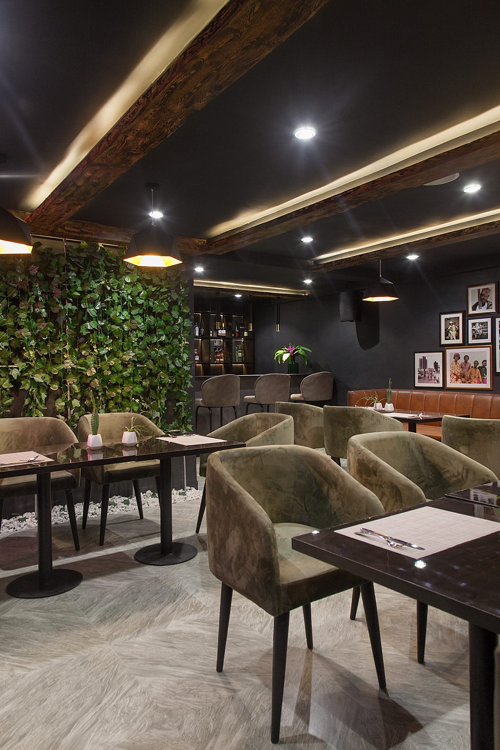 We imagined a space that felt like a secret, stylish escape. Our story began with a rich palette of deep browns and muted greens, creating an immediate sense of warmth and intimacy. The hero of the design is a breathtaking vertical garden wall, a splash of living nature that makes the whole room feel alive. We contrasted this with a curated gallery of black-and-white photos, adding a touch of cultural soul. Plush olive-green chairs and sleek tables completed the look, making the space feel both sophisticated and wonderfully comfortable.