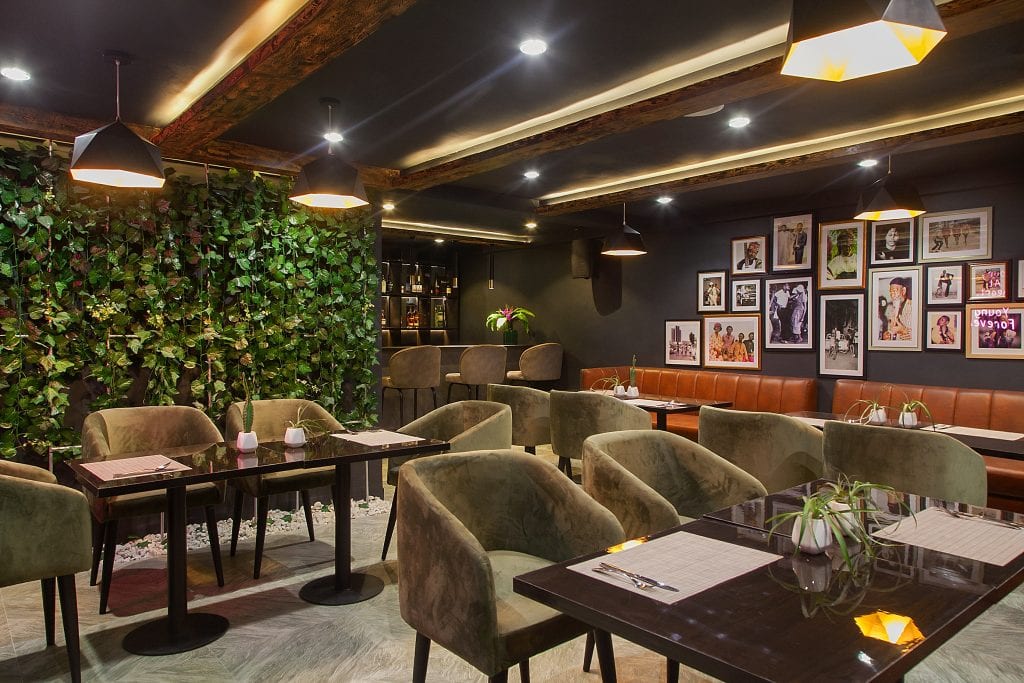 This elegant restaurant interior features a modern aesthetic with wooden tables and brown leather-cushioned chairs. Warm lighting from stylish hanging lamps complements the contemporary vibe.