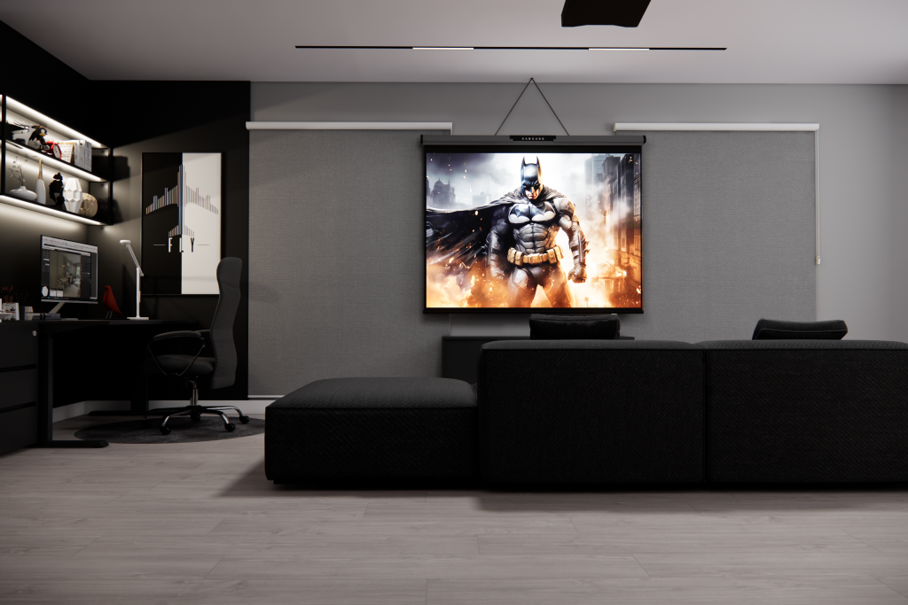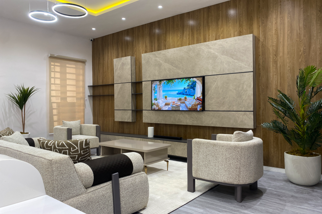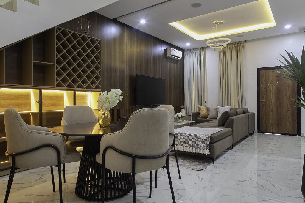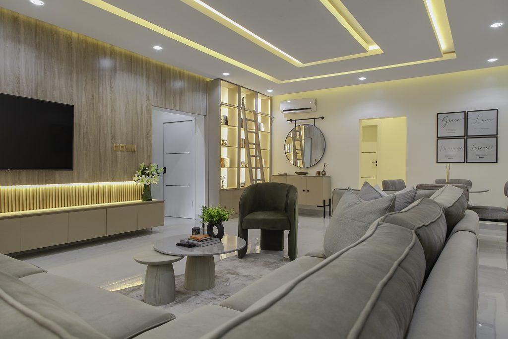 This modern living room features dark wooden wall paneling with built-in shelves and cabinets, which are illuminated from within. The space is well-lit with both natural and artificial light sources, enhancing the sleek and contemporary design.