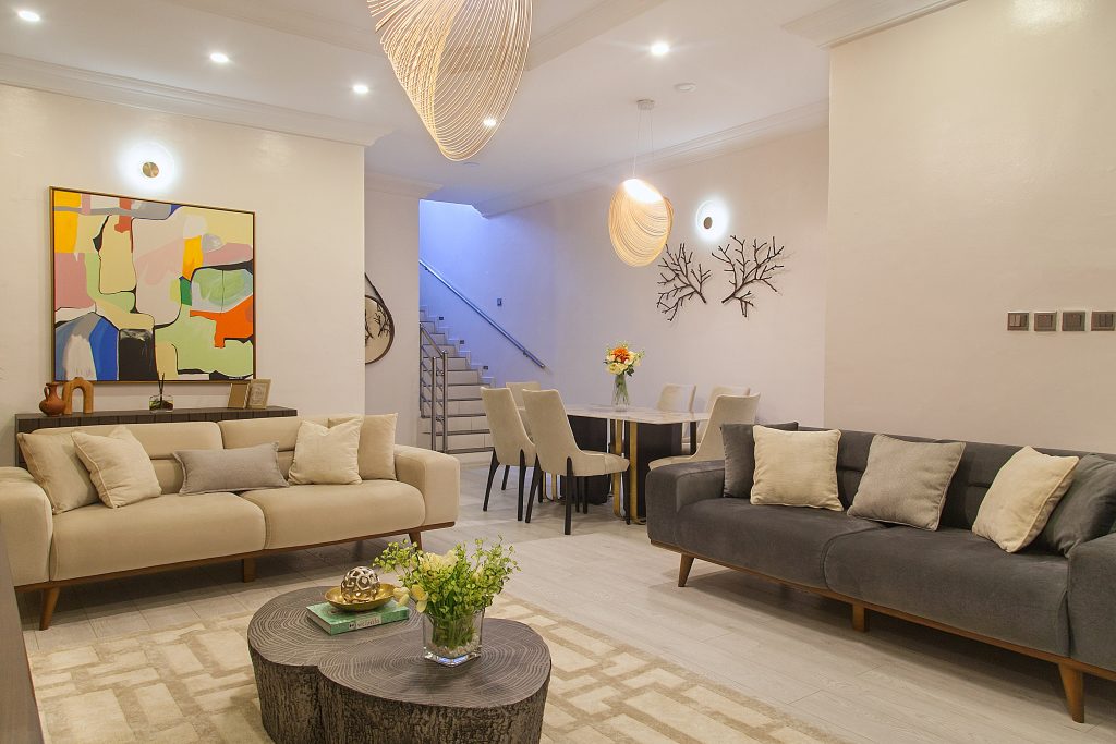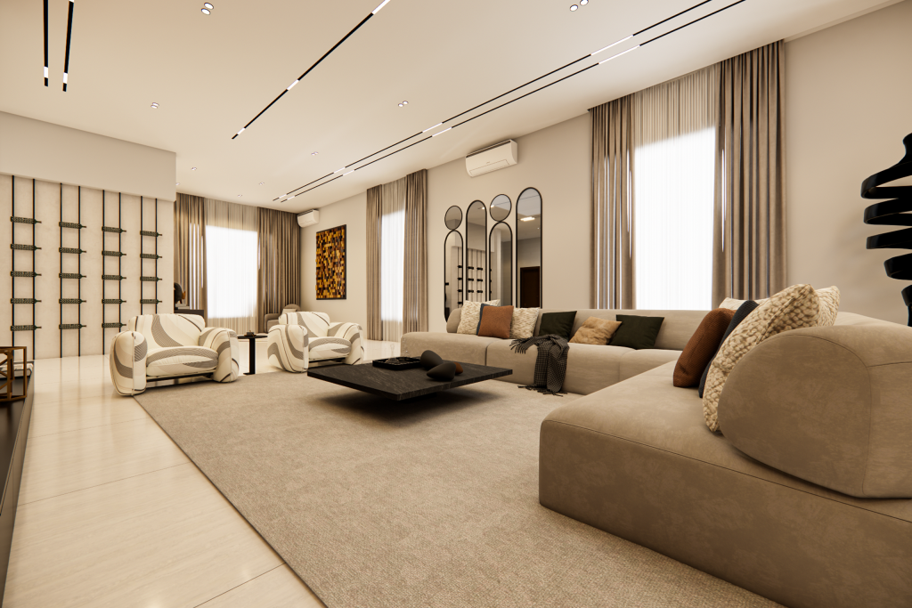This modern living room features a neutral color scheme with soft lighting to create a cozy and inviting atmosphere. The furnishing, artwork and styling with indoor plants placed strategically around the room, adding a touch of greenery.