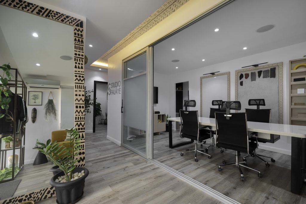 A corporate office for a real estate firm, blending modern corporate aesthetics with welcoming warmth. Sleek lines and Nigerian art pieces reflect professionalism with personality.