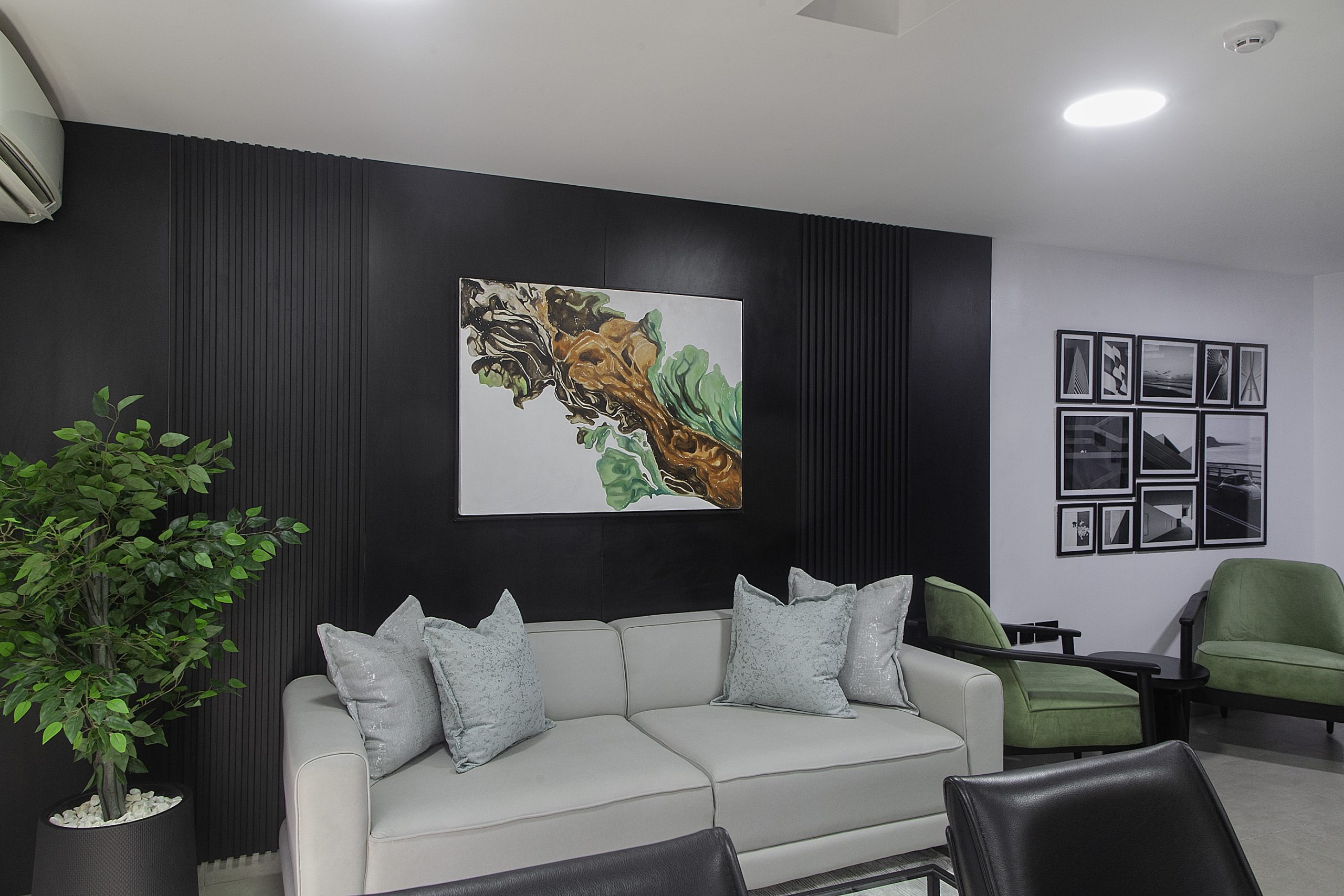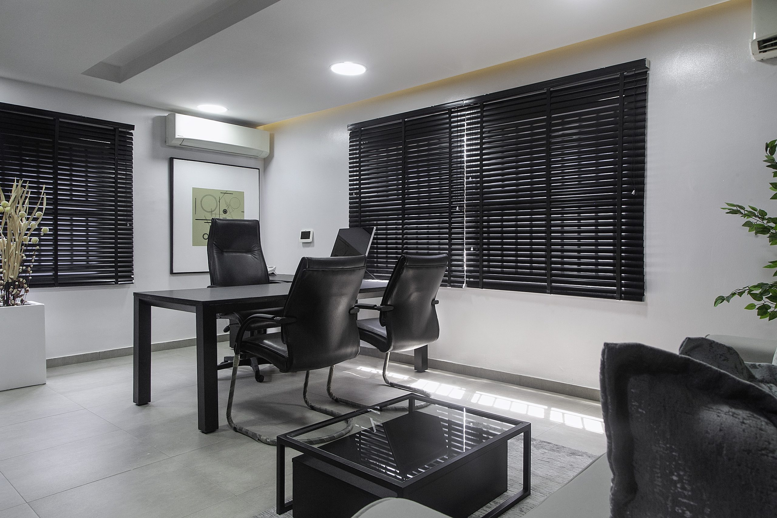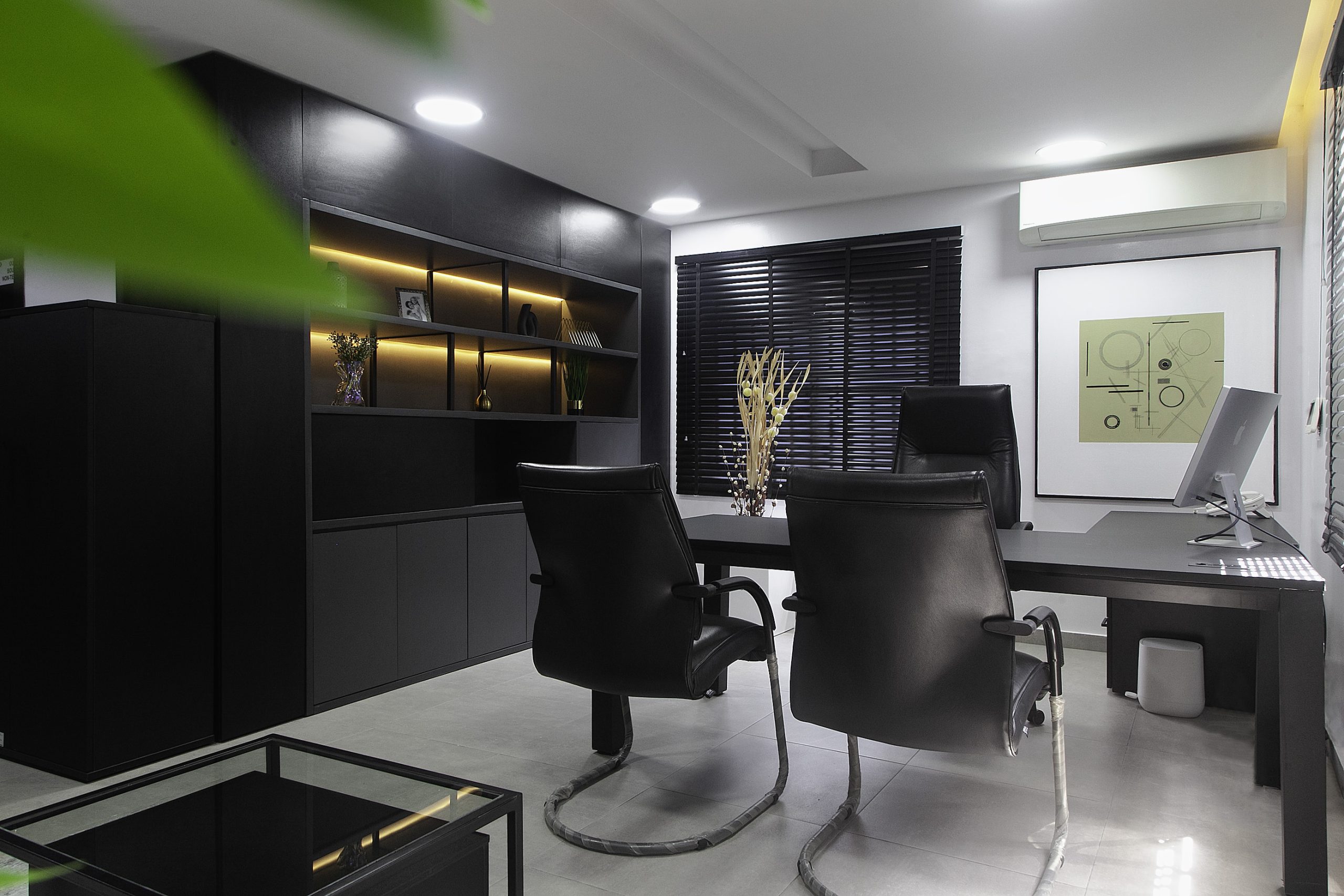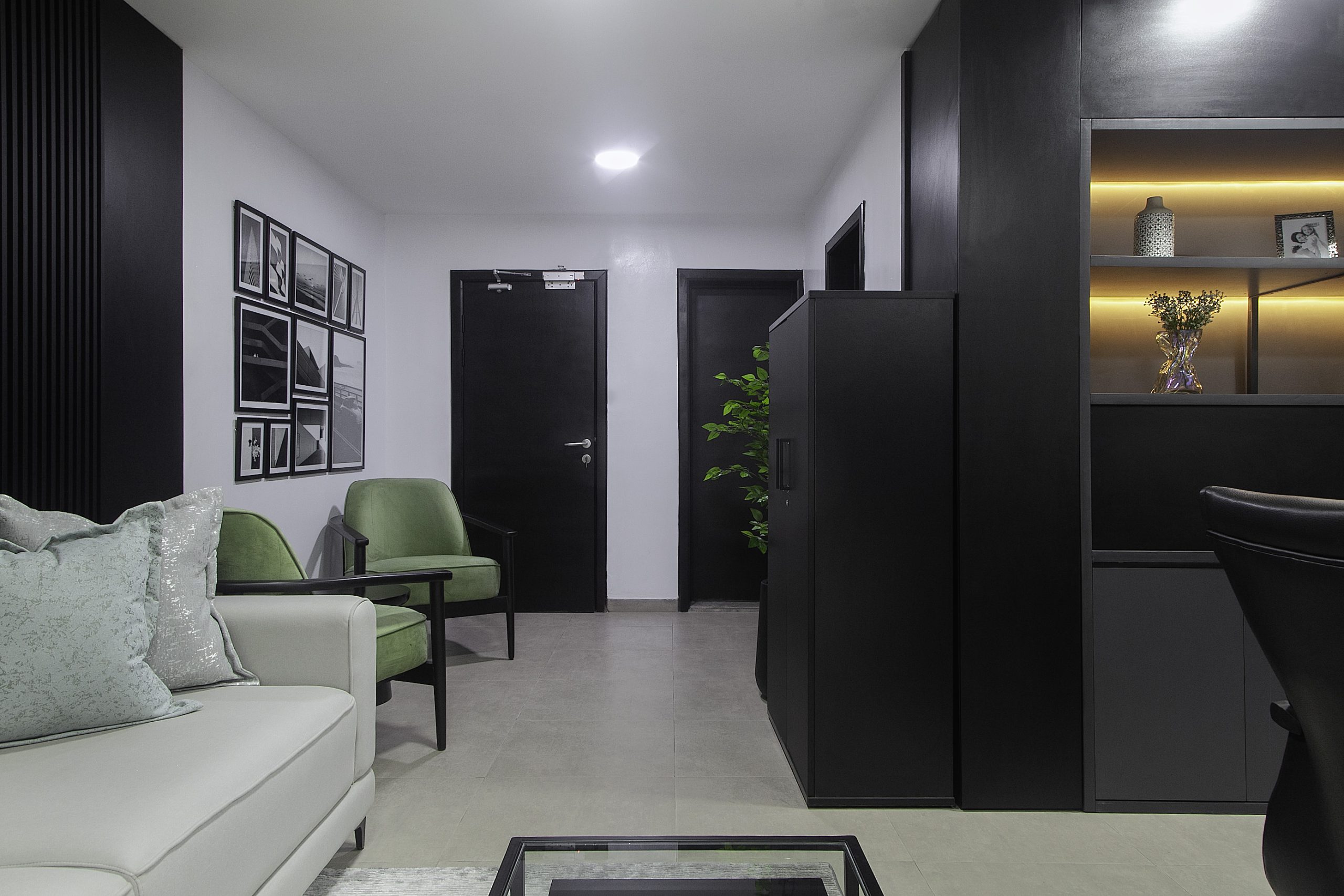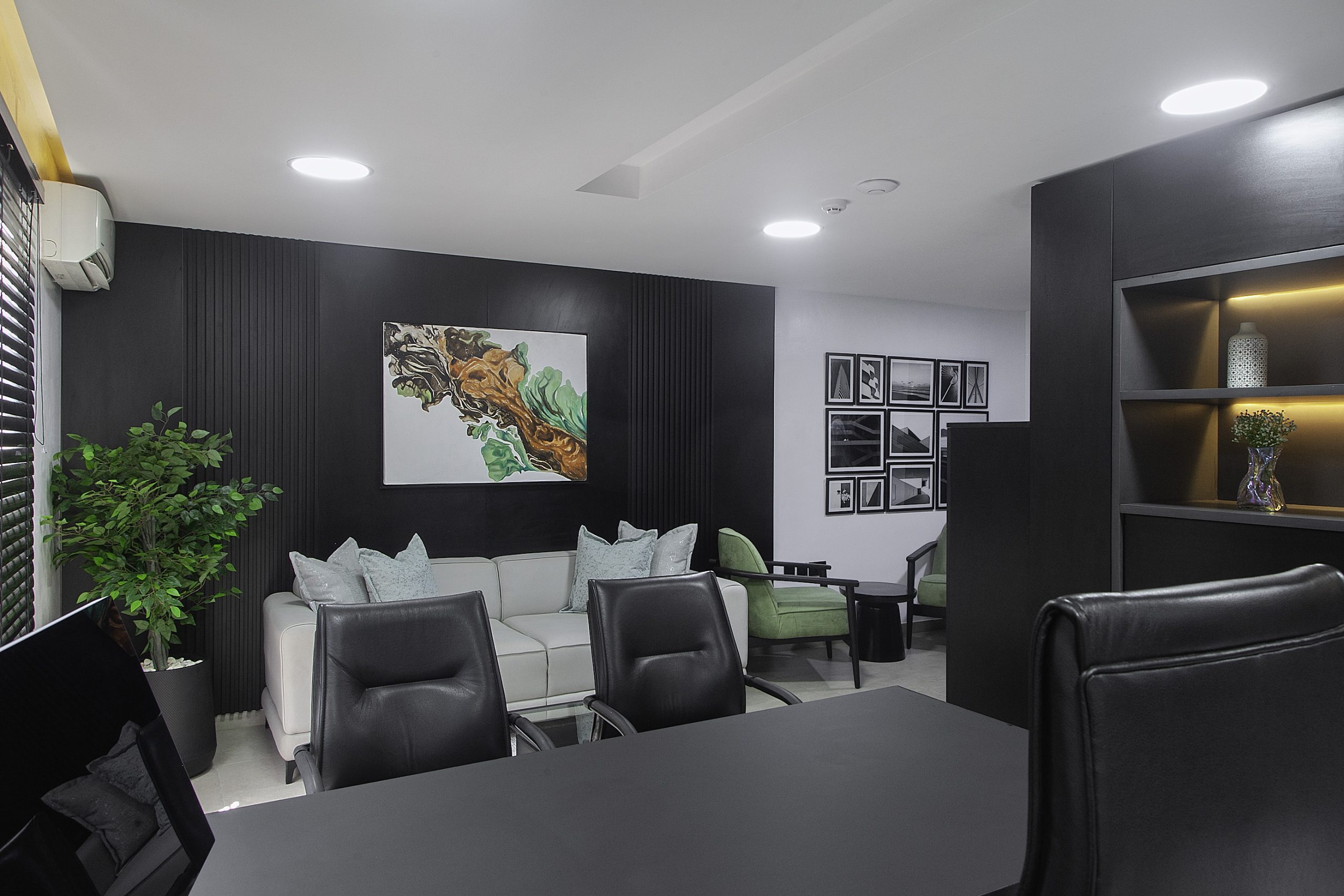 Our creative story unfolds in beautiful shades of black, white, and gray. We crafted a seamless journey, starting from a soft waiting area that flows into the main office. The heroes of this space are the bespoke furniture pieces, each custom-designed to feel special and intentional. To bring warmth to the cool palette, we layered in soft, ambient lighting that casts a gentle, inviting glow. A striking piece of abstract art adds a touch of creative soul, completing the polished and refined feel.