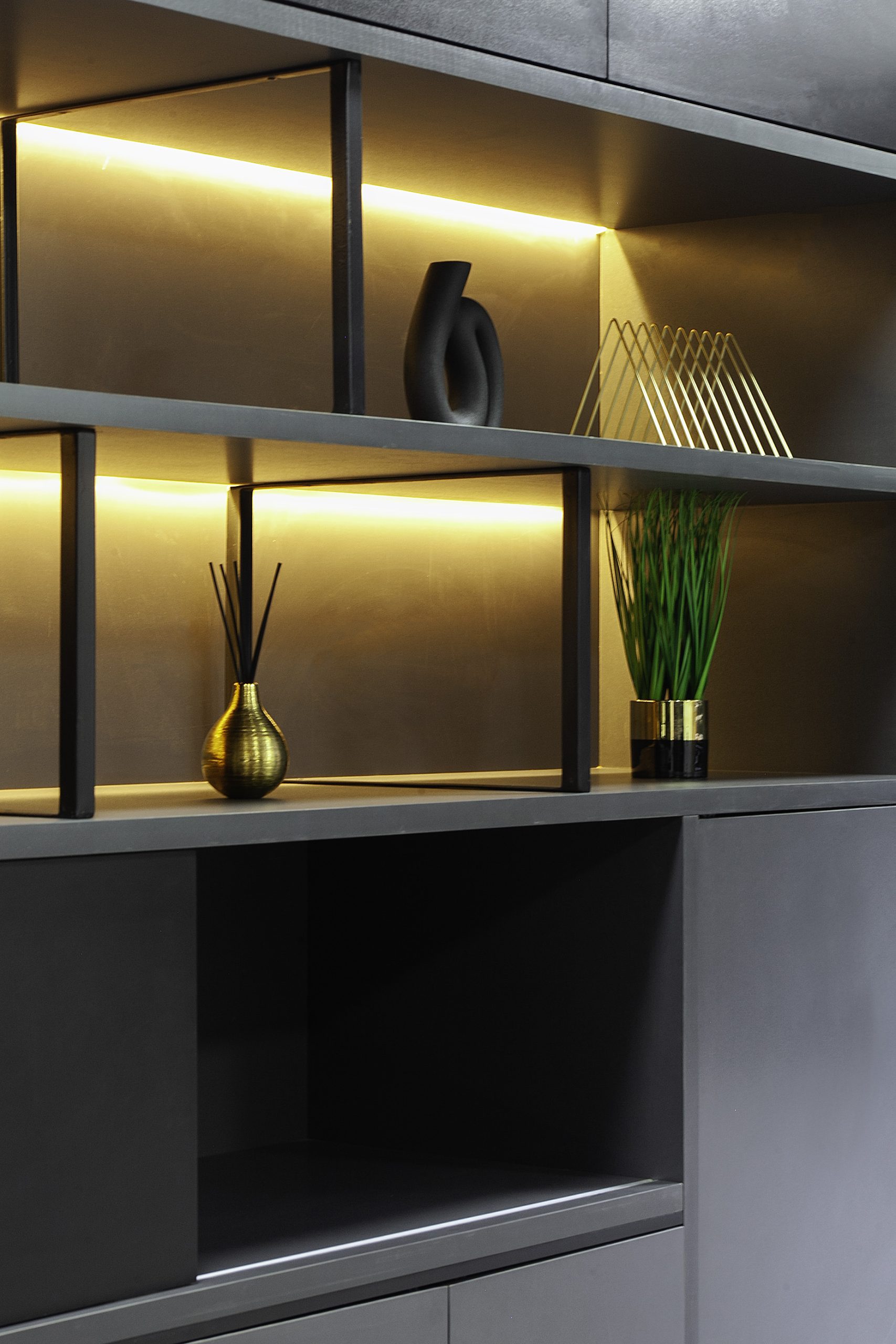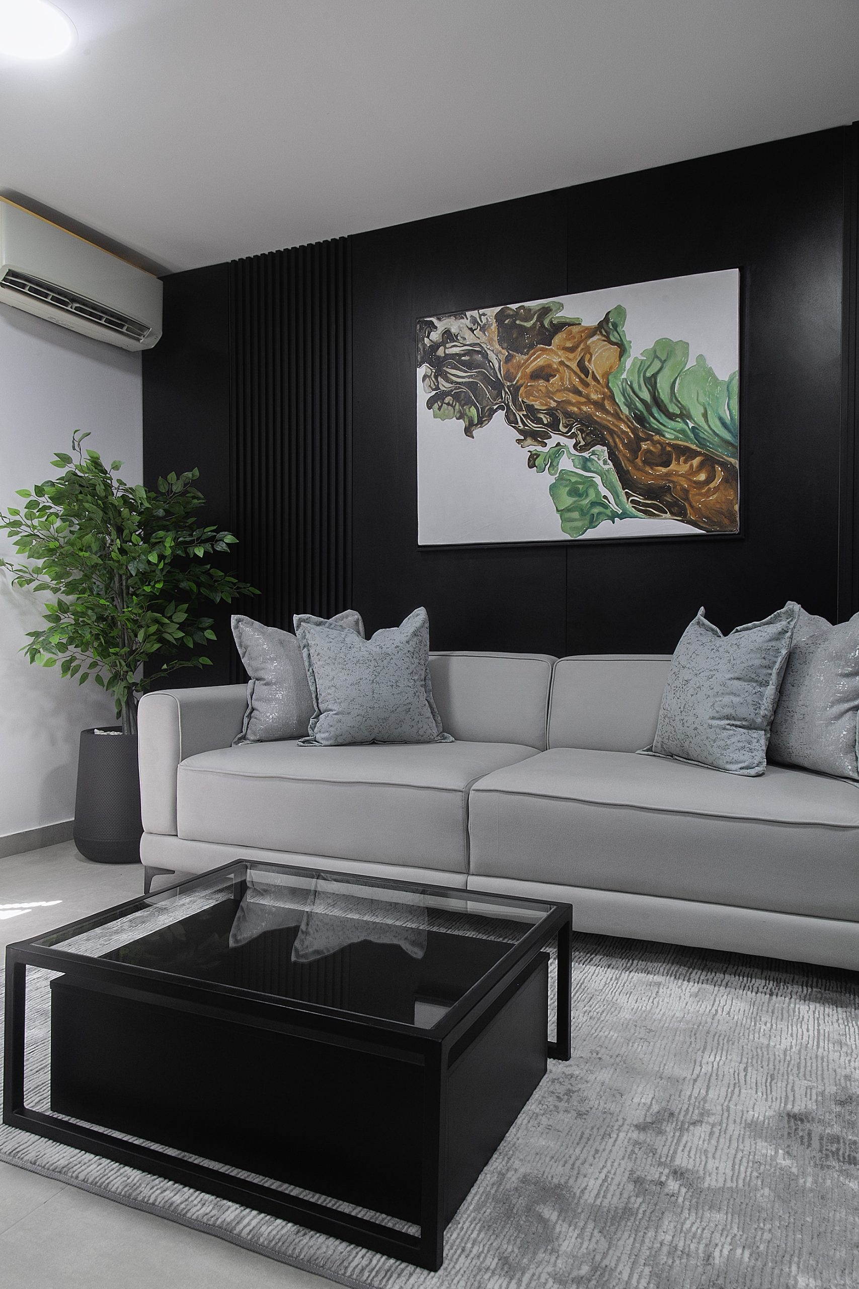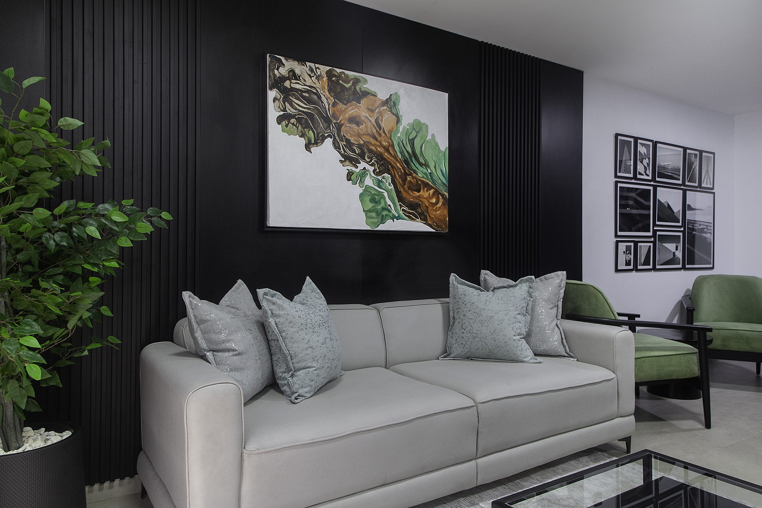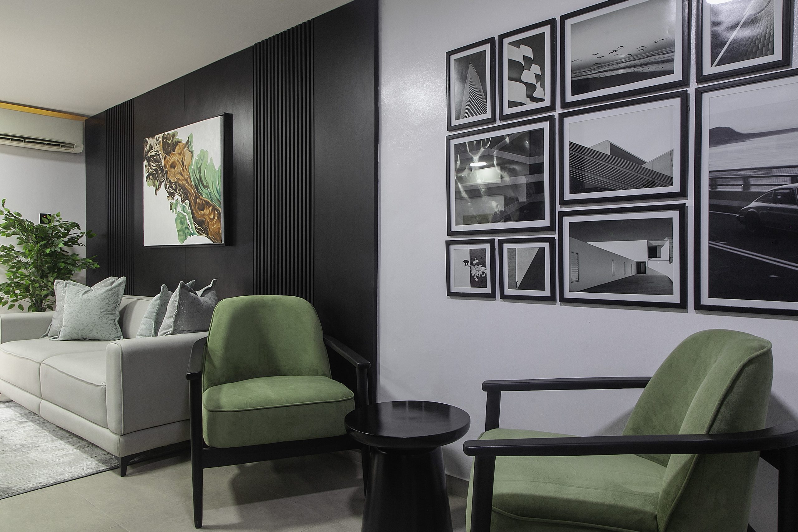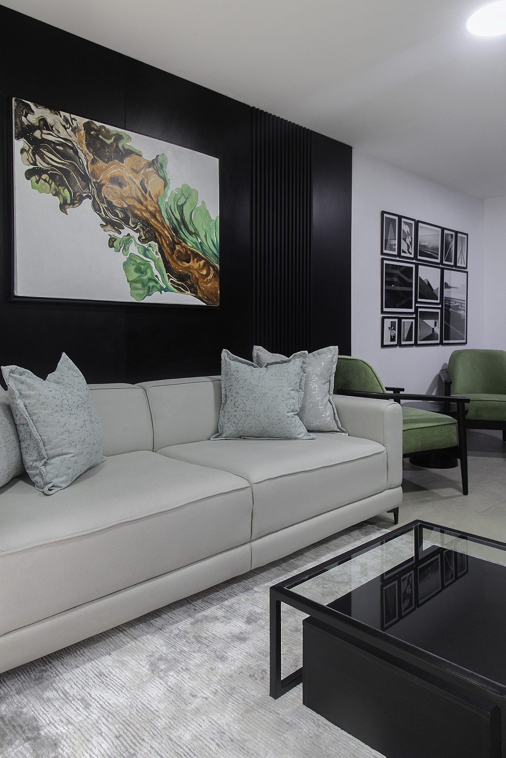Our creative story unfolds in beautiful shades of black, white, and gray. We crafted a seamless journey, starting from a soft waiting area that flows into the main office. The heroes of this space are the bespoke furniture pieces, each custom-designed to feel special and intentional. To bring warmth to the cool palette, we layered in soft, ambient lighting that casts a gentle, inviting glow. A striking piece of abstract art adds a touch of creative soul, completing the polished and refined feel.