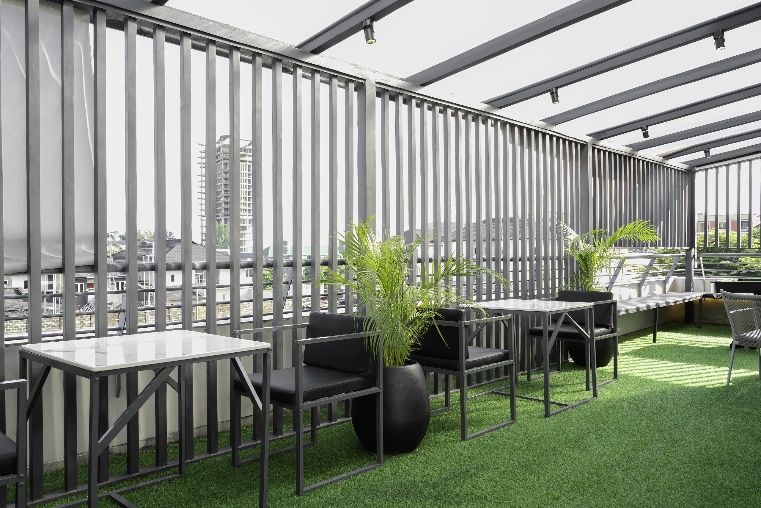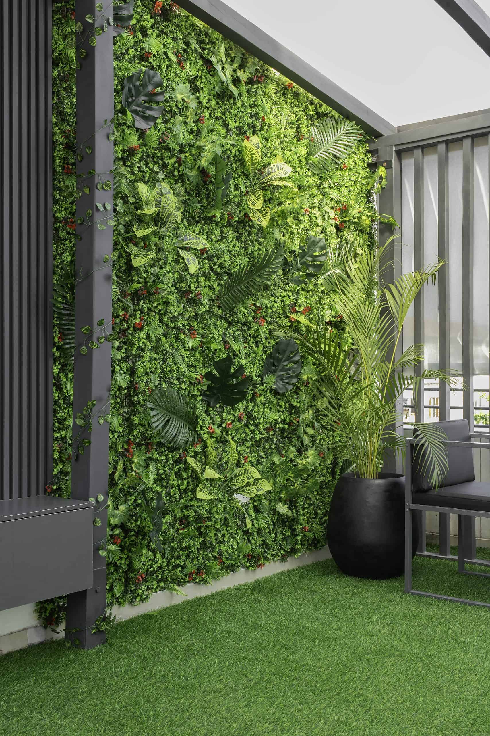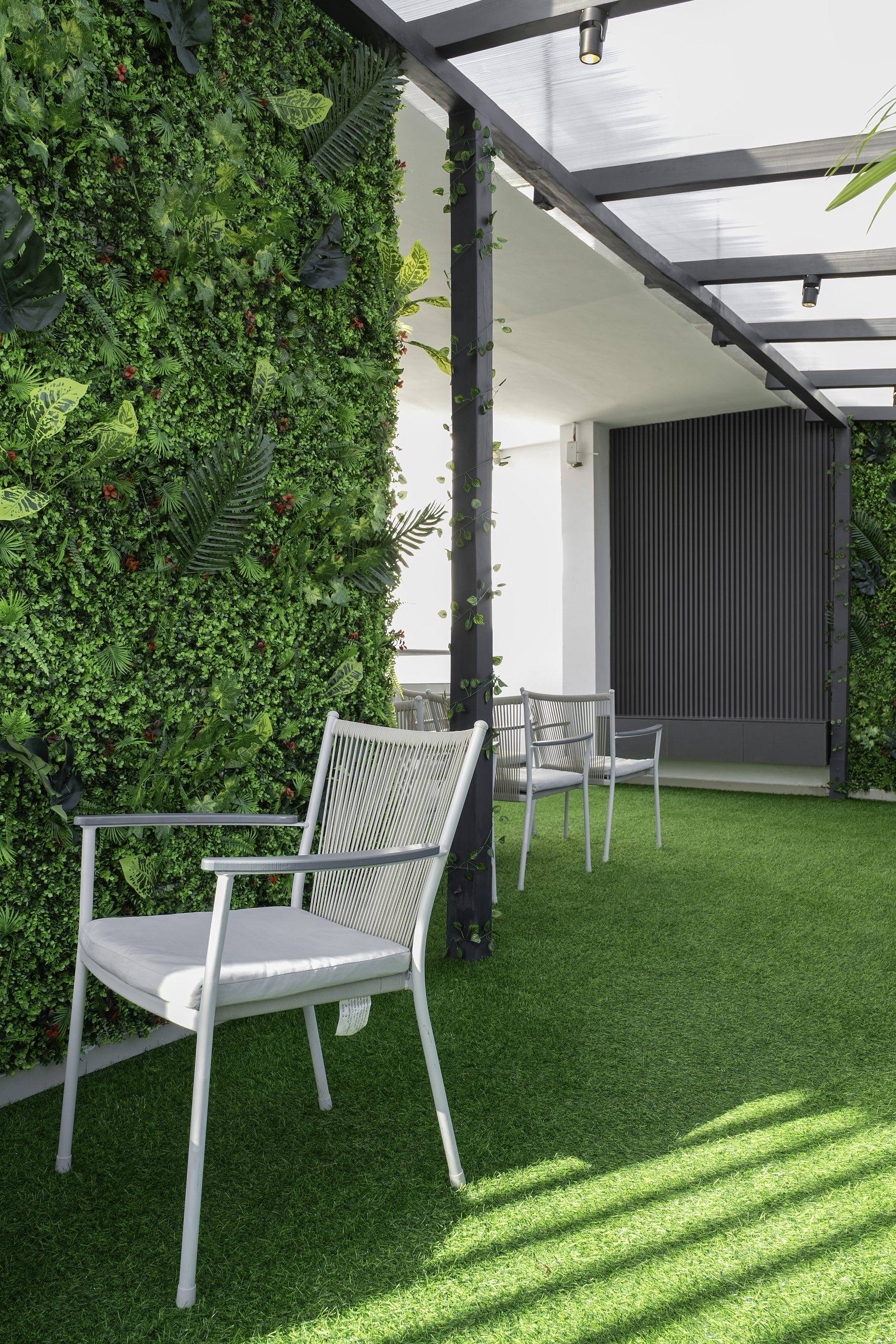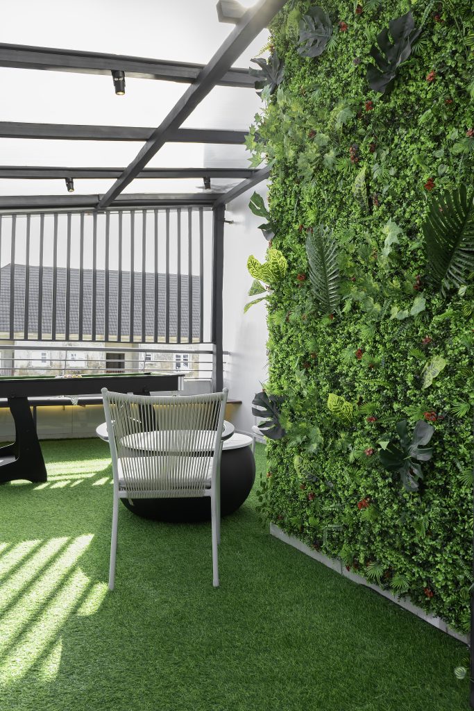 We told a story of modern elegance meeting natural charm. We started with sleek, contemporary furniture to create a sophisticated vibe. Then came the fun part: we designed a vibrant vertical garden wall that instantly brought a refreshing touch of nature to the city skyline. A translucent pergola roof above filters the sunlight beautifully, creating a soft, peaceful glow. The space was designed to be versatile, with cozy spots for quiet chats and open areas for social gatherings.